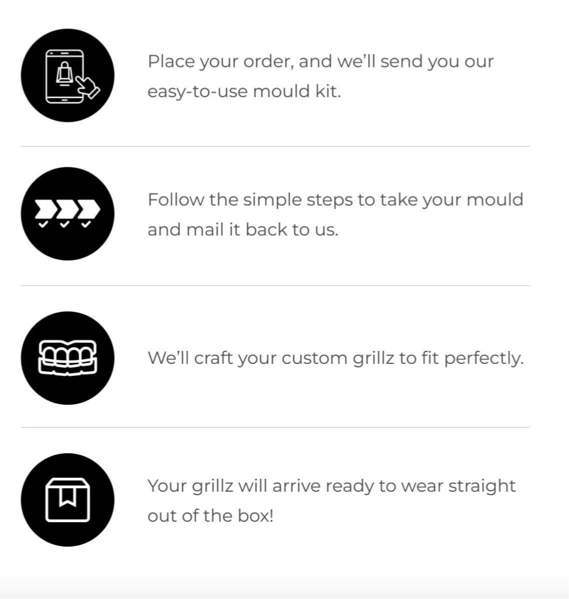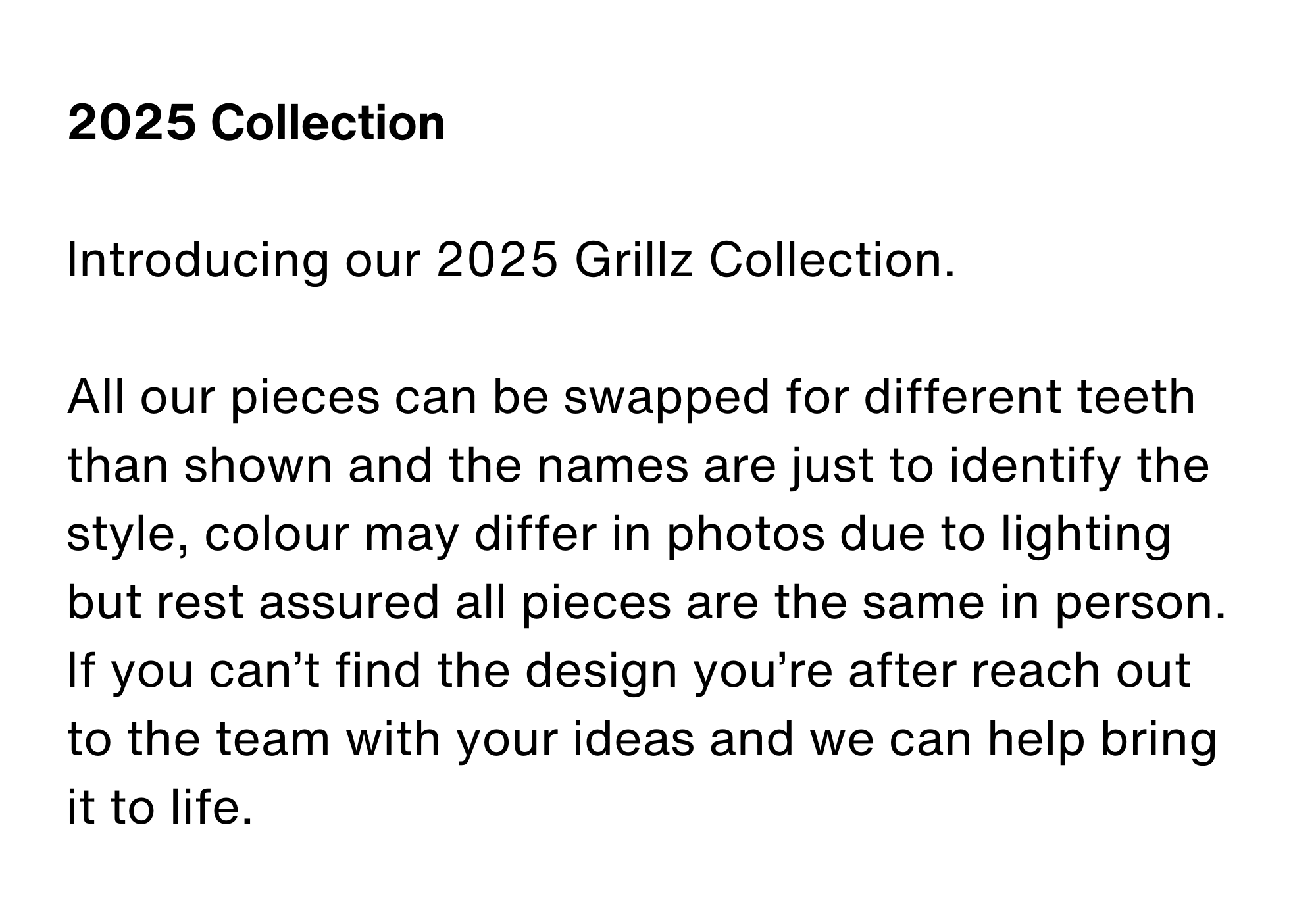 Our high-quality custom grillz are available worldwide, including Australia (Melbourne, Perth, Sydney), the U.S. and Europe.". We offer everything from gold grillz, silver grillz, and white gold grillz to fully iced-out grillz with VVS diamonds or moissanite stones for that unbeatable shine.