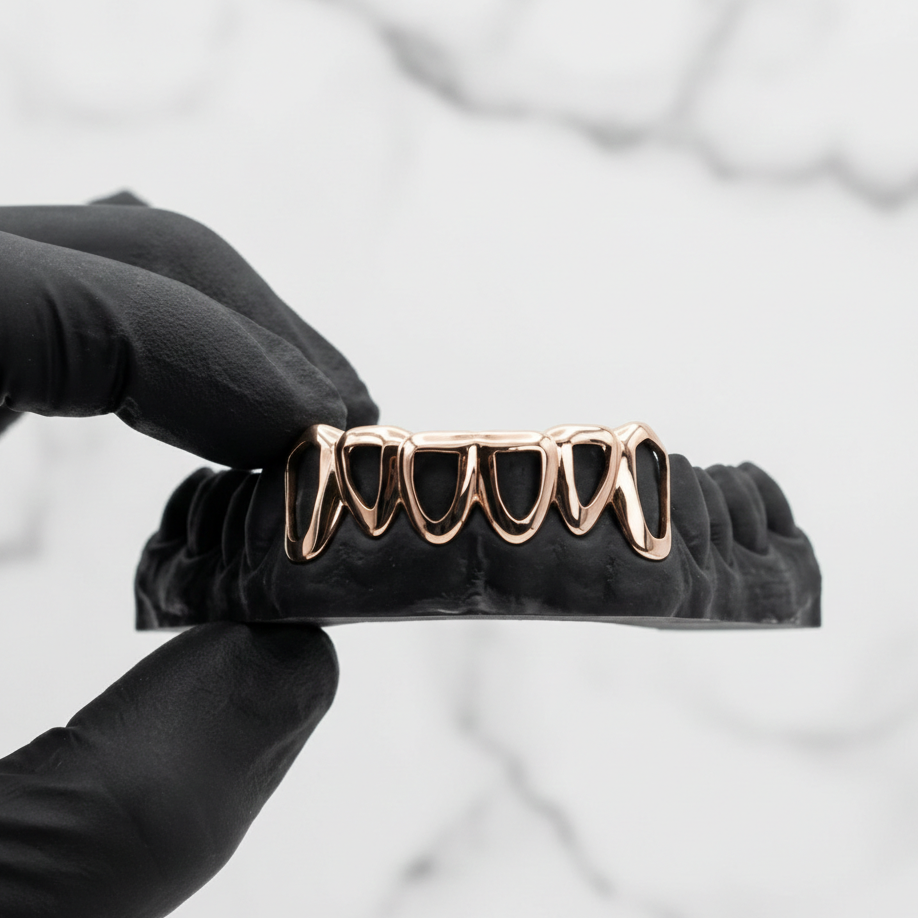At HC Grillz, we specialise in handcrafted gold grillz and silver grillz designed for a perfect, custom fit. Every piece is made with real materials — solid gold, sterling silver, and genuine diamonds — so your grillz never tarnish, fade, or lose shine. Unlike cheap plated options, our custom grillz are built to last and backed by a lifetime warranty.