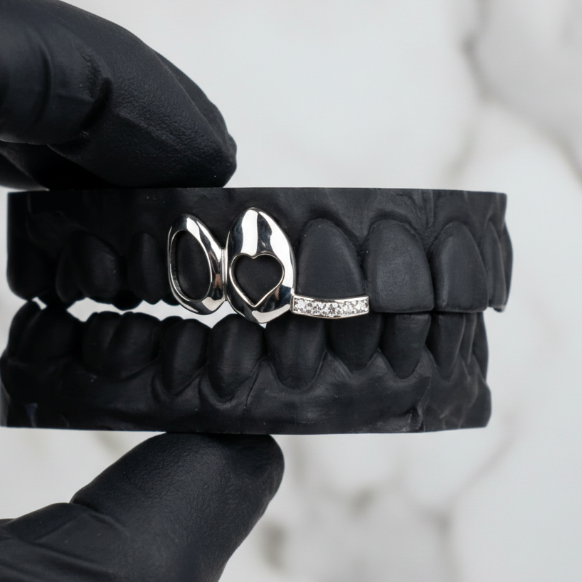 At HC Grillz, we specialise in handcrafted gold grillz and silver grillz designed for a perfect, custom fit. Every piece is made with real materials — solid gold, sterling silver, and genuine diamonds — so your grillz never tarnish, fade, or lose shine. Unlike cheap plated options, our custom grillz are built to last and backed by a lifetime warranty.