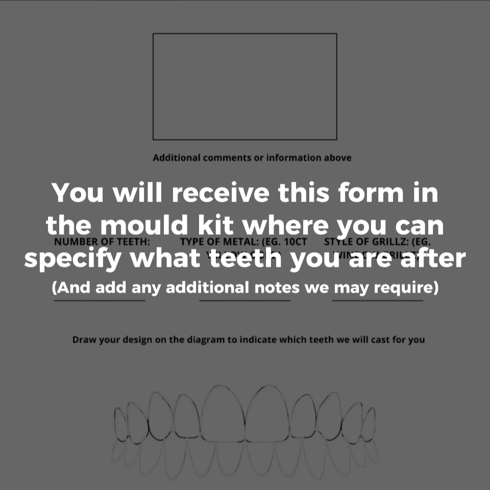 When you place an order for a set of gold or silver grillz there will be a form with a diagram for you sent with your HC grillz mould kit in the mail where you can mark exactly which teeth you want for your custom grillz!